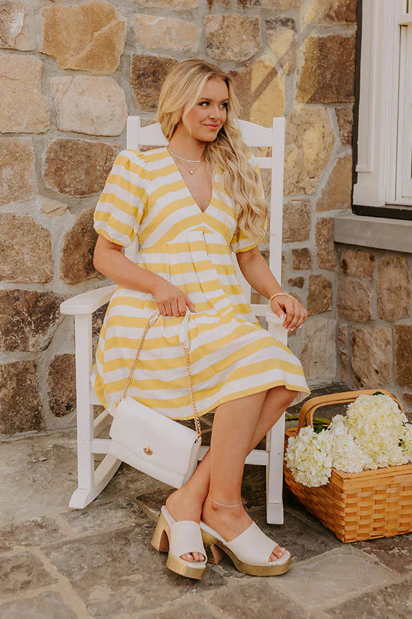 - Look forward to sunny skies and chic style with this darling dress! The timeless stripes and flirty silhouette make it a must-have for effortlessly cute and stylish outfits. - Fully lined material with a white and yellow stripe pattern - A v-cut neckline - Short puff sleeves with elastic cuffs - A waistline with an elastic back - Pleated detailing on the skirt - Hidden side pockets - A relaxed silhouette that ends in a mini dress length hemline