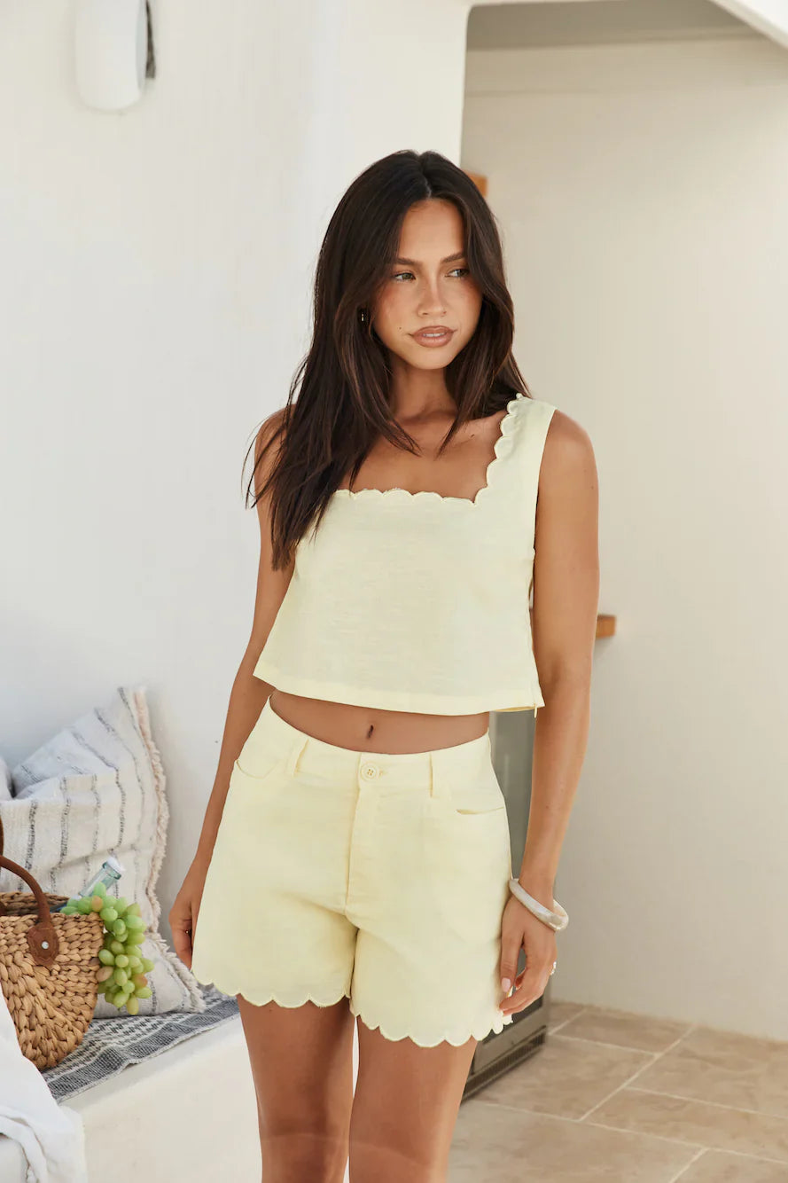 Effortlessly elegant with a touch of playful charm, the Sorrento Set in Lemon is your go-to for sun-soaked adventures and breezy summer days. Featuring a cropped tank with a flattering square neckline and delicate scalloped edges, this set brings a feminine and polished feel.