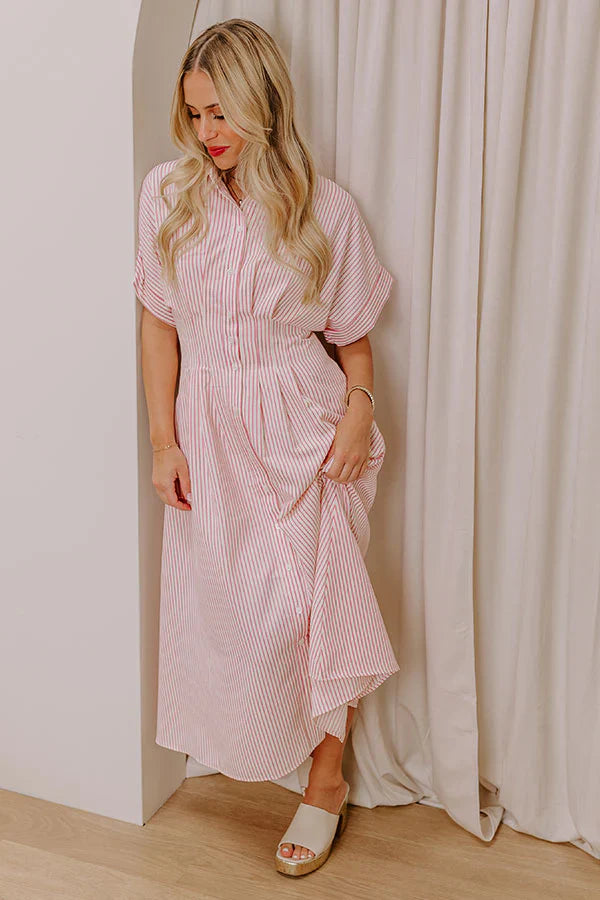 - Stay effortlessly stylish with this timeless dress! Featuring a classic stripe print and a flattering pleated waistline, it's the perfect go-to for casual outings, workdays, or weekend plans. - Striped material featuring ivory and an pink hue - A built-in partial lining - A collared neckline - A buttoned front - Short sleeves with rolled cuffs - Pleated accents at the waist - Hidden side pockets - A flowy silhouette that ends in a straight hemline