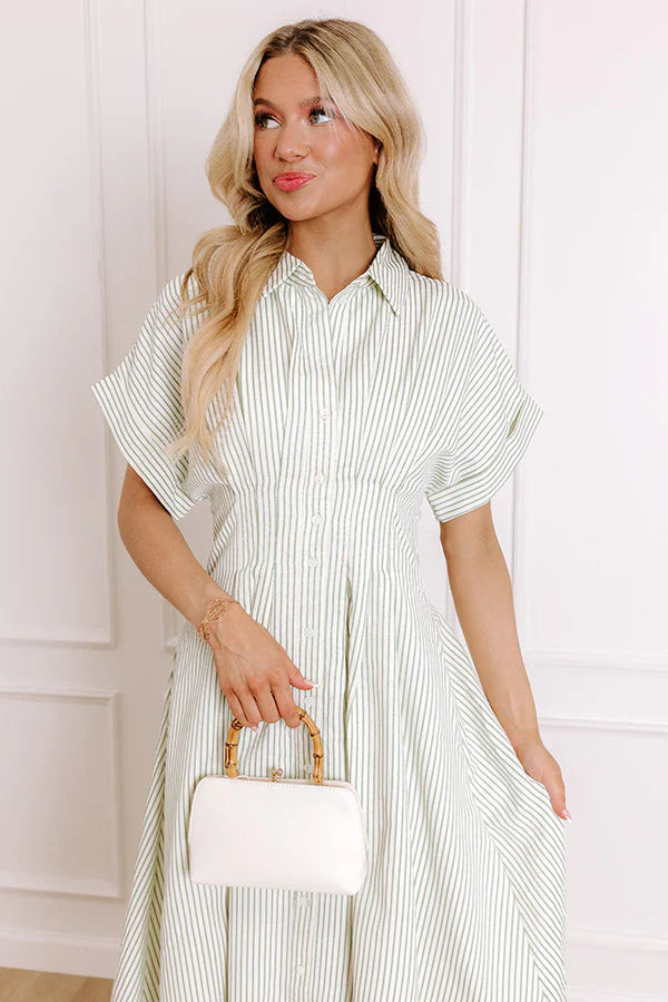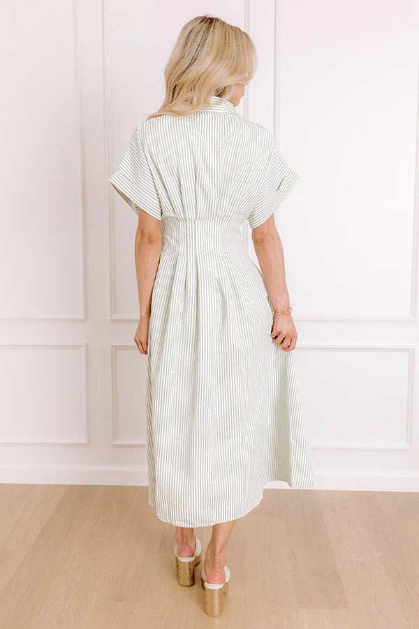 - Stay effortlessly stylish with this timeless dress! Featuring a classic stripe print and a flattering pleated waistline, it's the perfect go-to for casual outings, workdays, or weekend plans. - Striped material featuring cream and an sage hue - A built-in partial lining - A collared neckline - A buttoned front - Short sleeves with rolled cuffs - Pleated accents at the waist - Hidden side pockets - A flowy silhouette that ends in a straight hemline