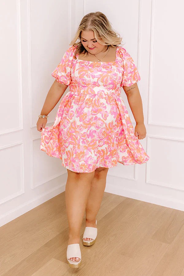 - Bring a little sunshine to your wardrobe with this adorable floral mini dress! With its bold print and charming puff sleeves, it's the perfect piece to brighten your day. Get ready to turn heads and feel fabulous in this cutie! - Subtly textured material with a cream, orange, and different shades of pink - A square cut neckline with an elastic back - Short puff sleeves with elastic shoulders and elastic cuffs - A smocked back - A waistline with an elastic back - A flowy and flattering silhouette that ends in a straight, mini dress length hemline