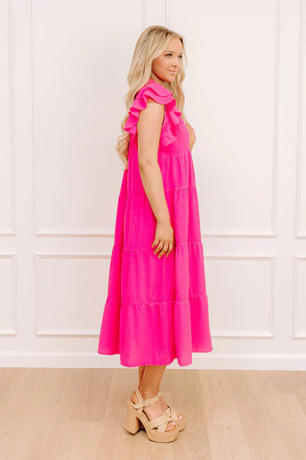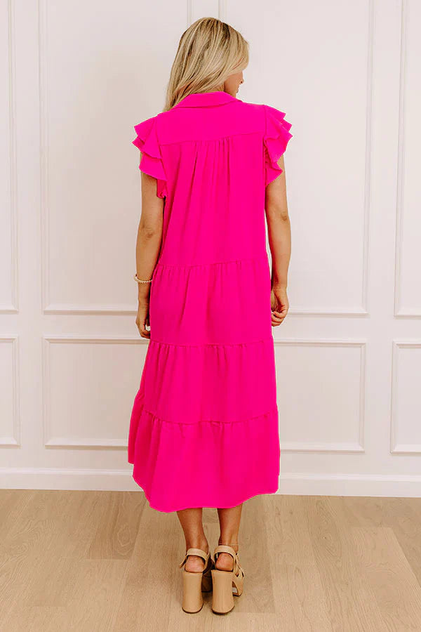 - This breezy midi dress is full of casual charm with sweet flutter sleeves. Perfect for effortless, stylish days all season long. - Breezy unlined material with a subtle texture - A collared v-cut neckline - Short flutter sleeves - A flowy silhouette that ends in a subtle, midi length high-low hem