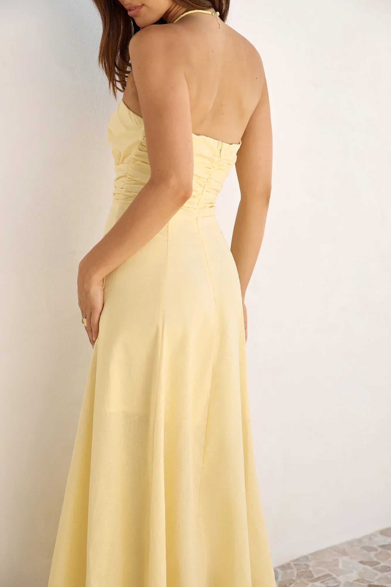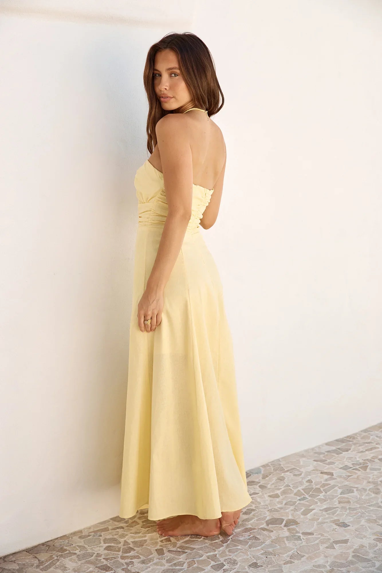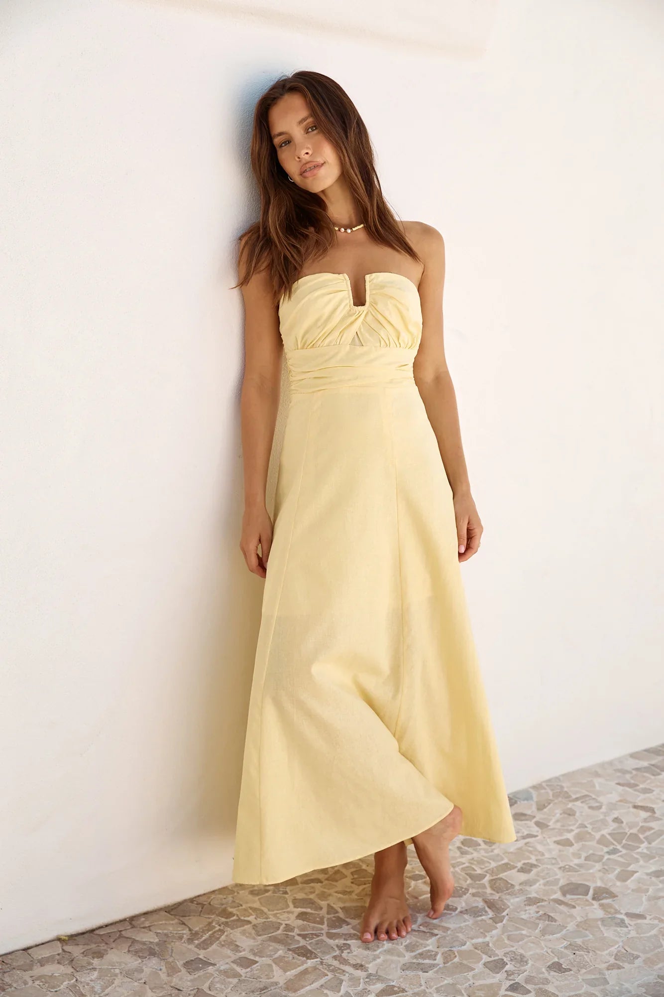 Radiate pure joy with the Sunshine Bliss Strapless Maxi Dress in Yellow, a vibrant and carefree piece that embodies the spirit of sun-soaked bliss, ensuring you shine bright at summer gatherings and exude effortless elegance with every step. Pair with yellow strap heels to match and gold adornments to elevate.