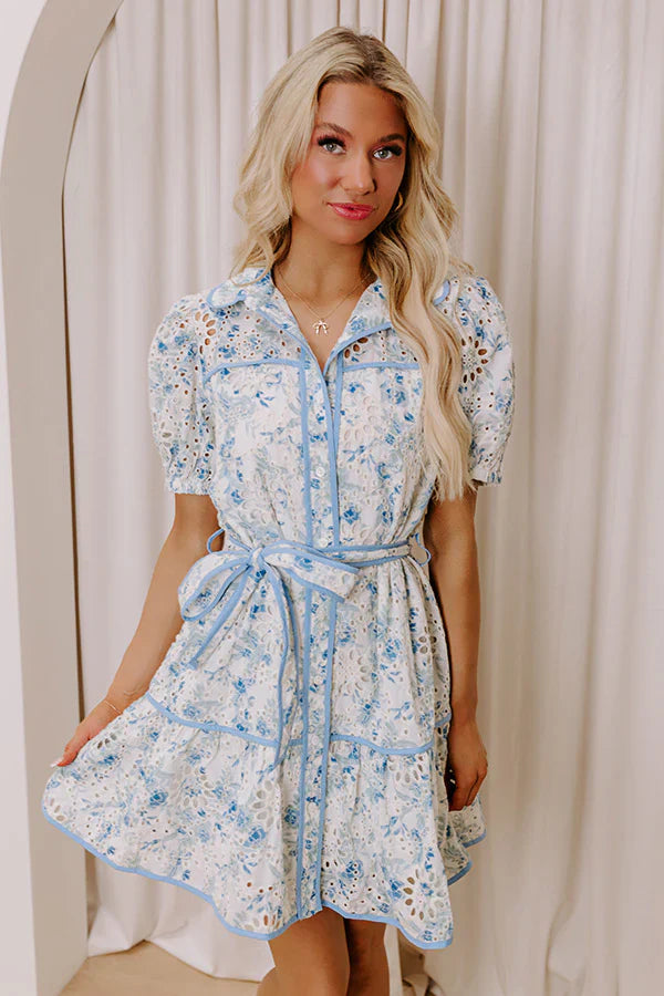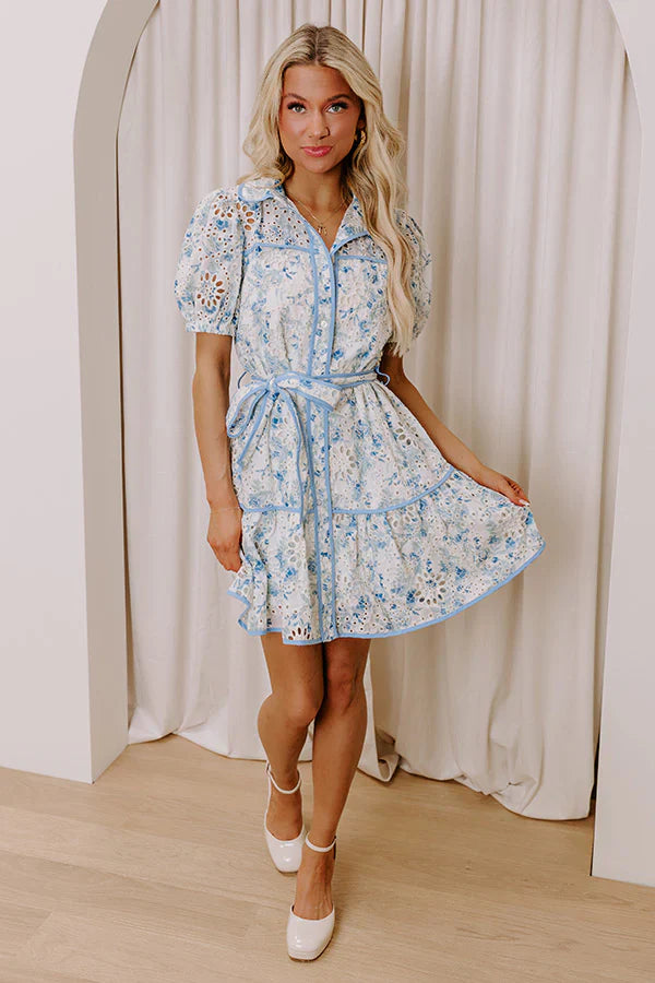 - Make a charming impression with this darling mini dress! Perfect for embracing floral season, this cutie has sweet eyelet material and a flattering belted waistline to keep you looking fabulous. - Eyelet material with cream colored embroidery featuring a pear, and blue hued floral print - Blue hued accent trim - A built-in lining - A collared neckline - A buttoned front - Belt loops and a removable tie closure belt - Short puff sleeves with elastic cuffs - A flattering silhouette that ends in a mini dress length hemline