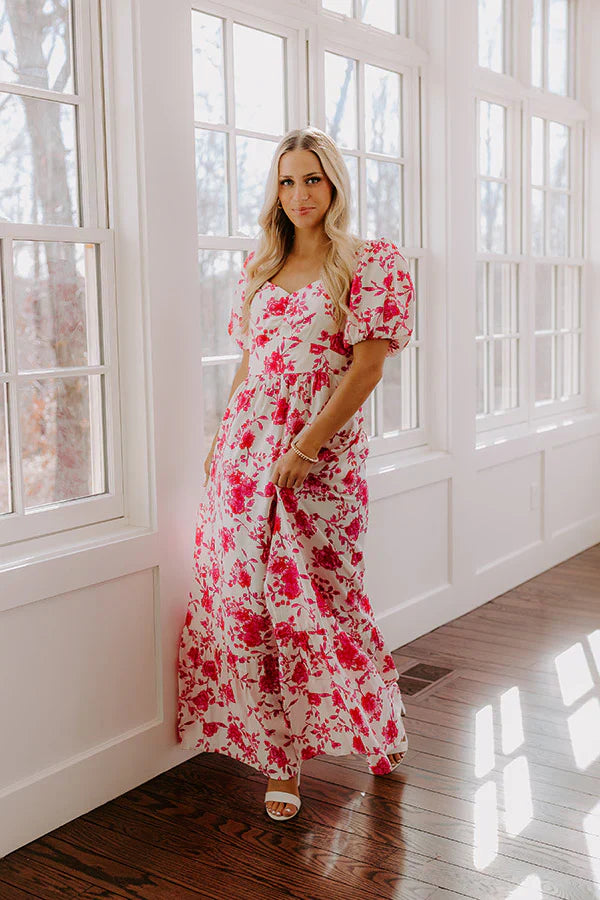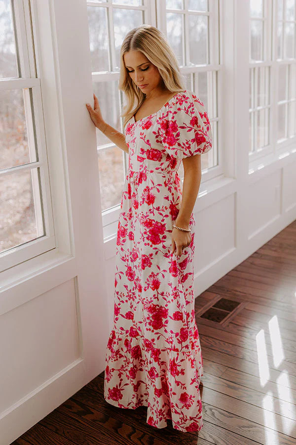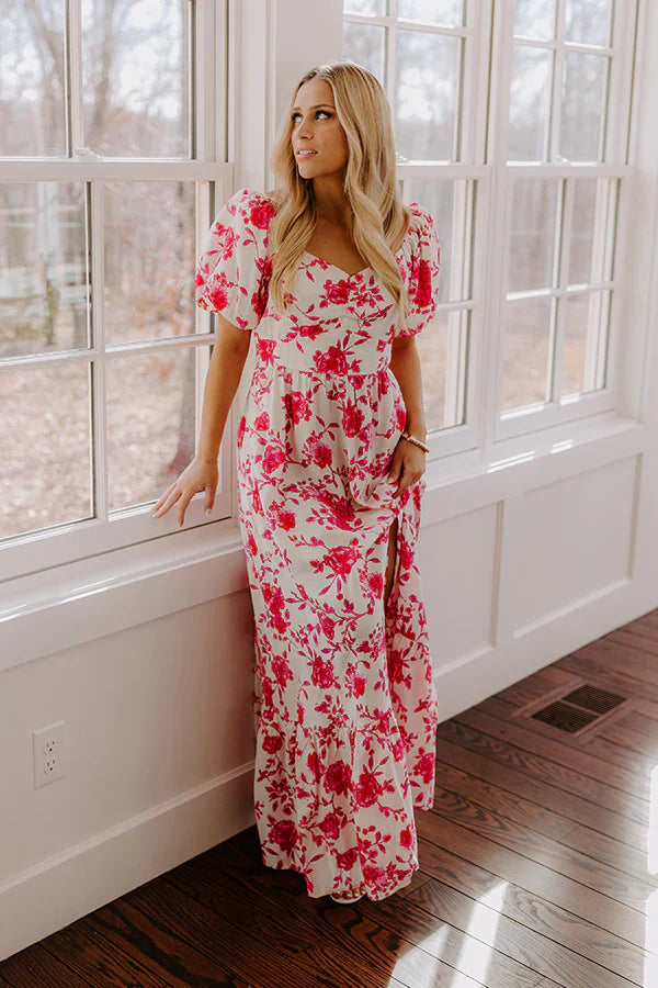 - This floral maxi is pure charm! From its adorable puff sleeves to the flirty little accent slit, it's a look that's ready to twirl through your day and steal all the compliments along the way. - Lightweight material with an orchid, red, and pink colored abstract floral print - A built-in bust lining - A sweetheart neckline with ruched detail - Short, puff sleeves with elastic shoulders and elastic cuffs - A smocked back - A waistline with an elastic back - Hidden side pockets - A flowy and flattering silhouette that ends in a straight, maxi length hemline with a side slit accent