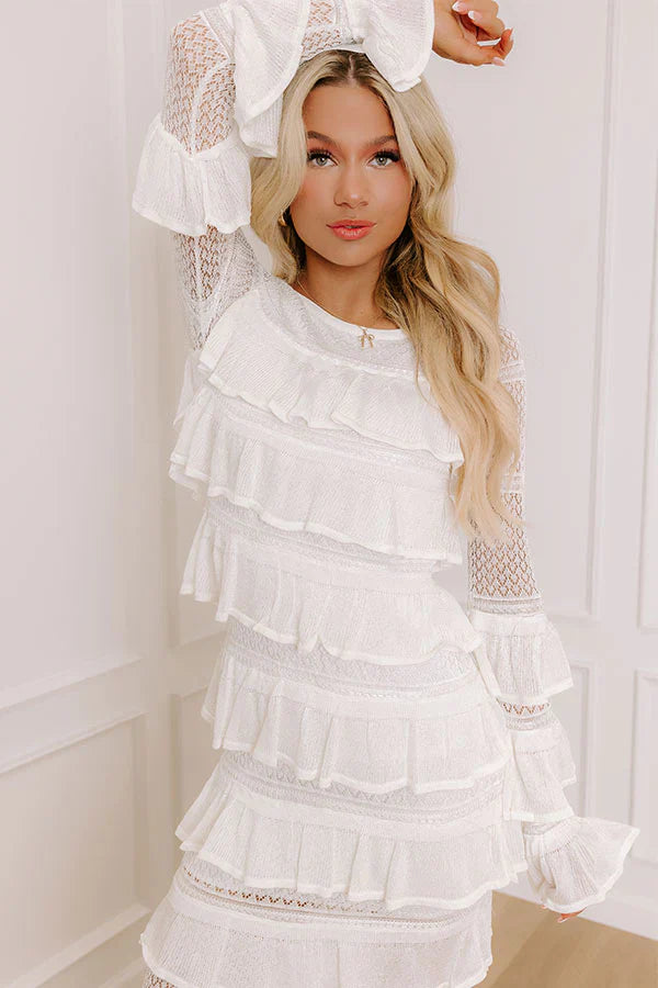 - This maxi is a total dream! The flowy, tiered design and delicate pointelle knit make it perfect for twirling through your day. - Pointelle knit material - A built-in partial lining ending at knee length - A round neckline - Long, unlined sleeves with ruffle accents and ruffle cuffs - A flattering tired silhouette that ends in a maxi length hemline