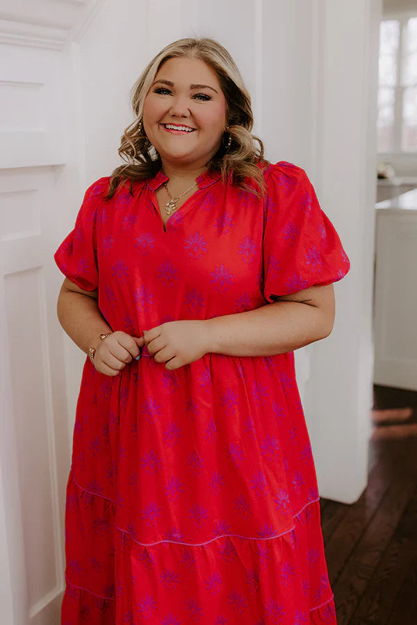 - Treat yourself to a sweet moment in this adorable maxi dress! With its charming print and timeless design, it's the perfect pick for date night or brunch with your favorite people. - Red colored, lightweight material with a purple hued abstract floral print - A v-cut neckline with frilled detailing on the back - Short, puff sleeves with elastic cuffs - Hidden side pockets - A relaxed silhouette that ends in a straight hemline