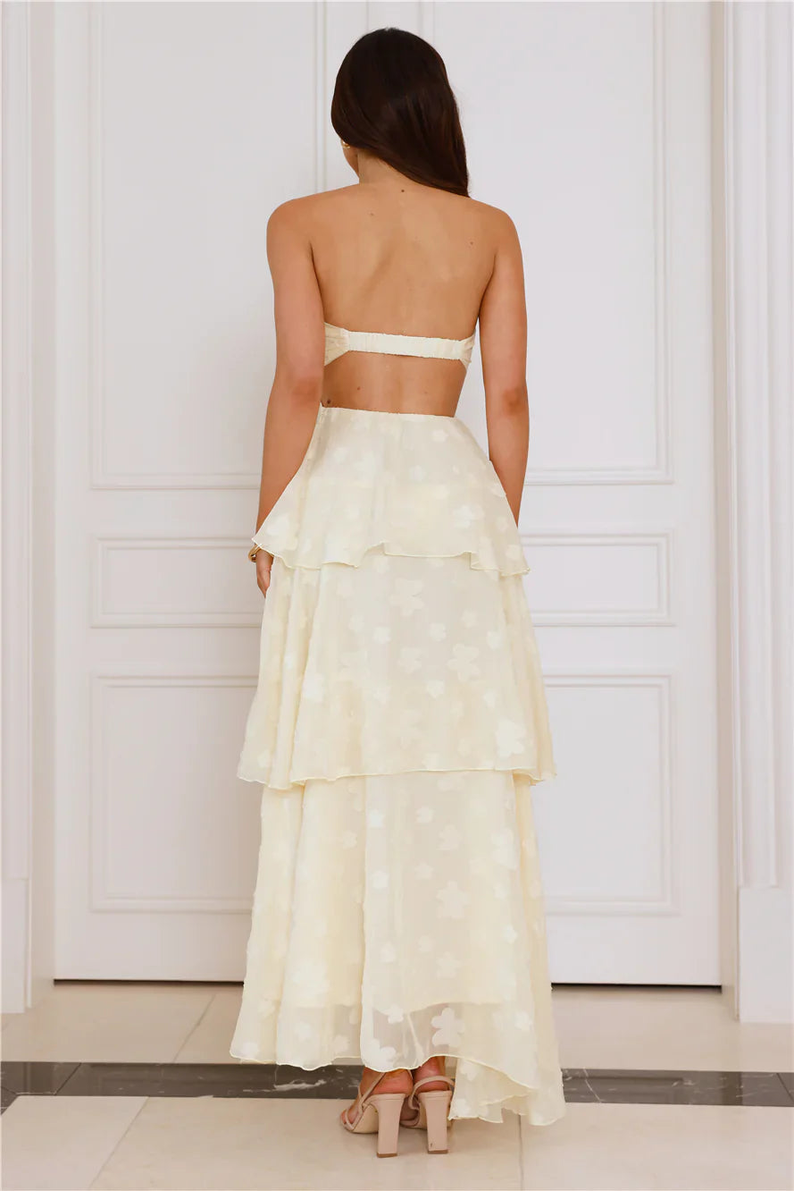 Embrace your flirty, fun style in the dreamy Tranquil Twilight Strapless Maxi Dress. Featuring an elastic back, a tie-up top and a gorgeous tiered frill skirt. Style with heels and curls for a 'fit you'll want pics' in!