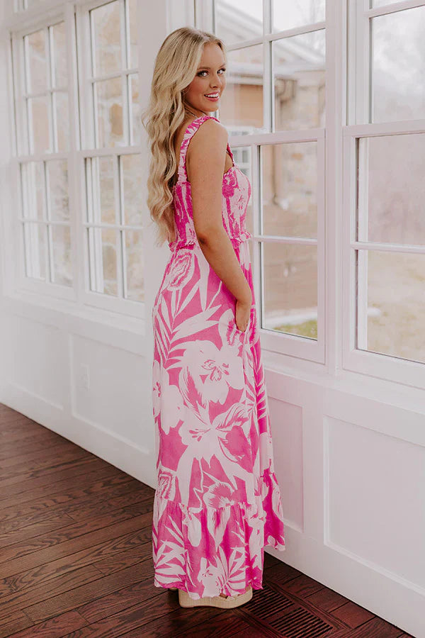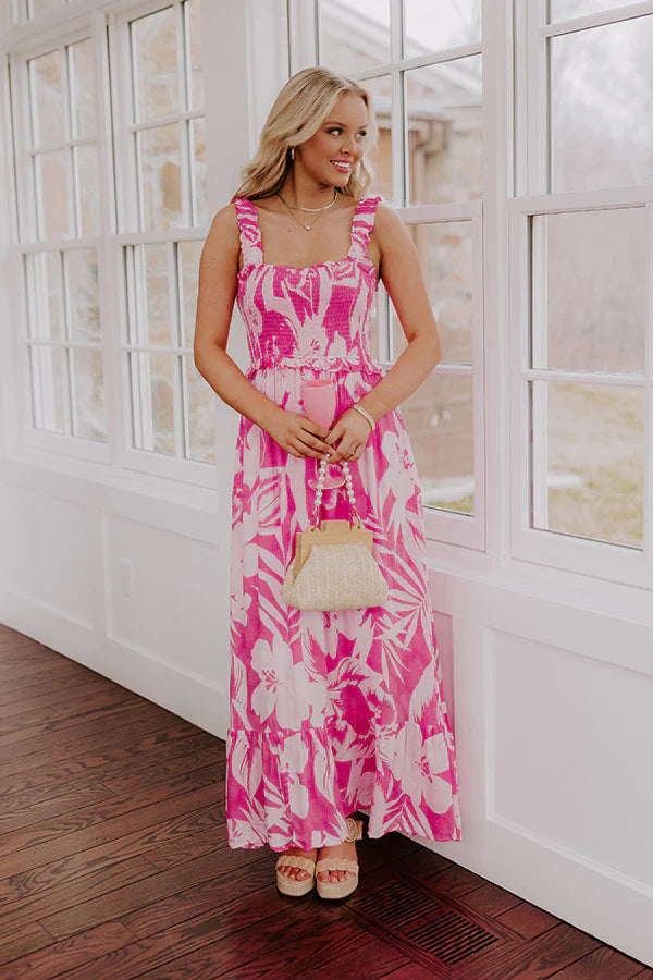 - Twirl through the tropics in this floral maxi dress! The smocked design and stunning print combine for a look that channels all the island vibes you need this season. - Lightweight material with a pink hued floral print - A ruffled square cut neckline - Elastic straps with ruffle detailing - A smocked bodice - An elastic waistline with ruffle detailing - A built-in skirt lining - Hidden side pockets - A flowy and flattering silhouette that ends in a maxi length hemline