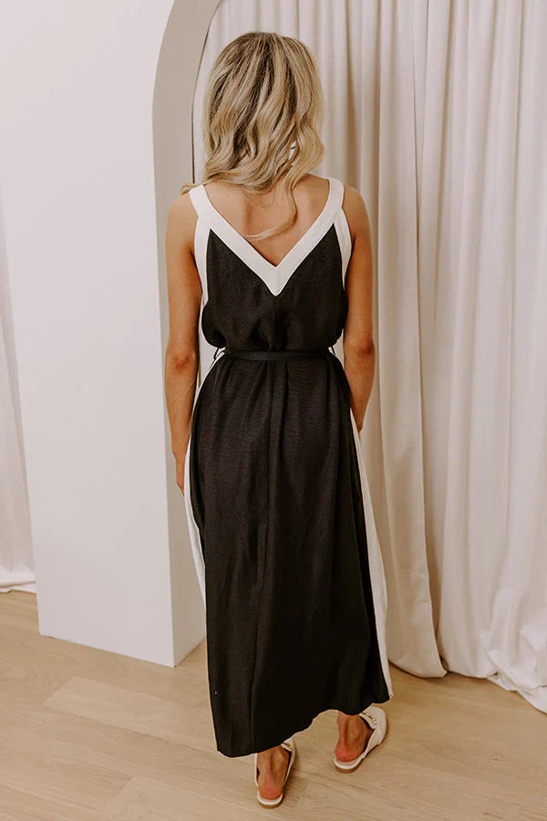- Step out in everyday elegance with this fabulous dress! Its stylish black and cream design and flattering belted waistline make it perfect for creating polished looks. - Lightweight material - Cream colored accent trim - A built-in partial lining ending above the knee - Belt loops and a tie closure belt - Functional side pockets - A flowy silhouette ending in a straight hemline