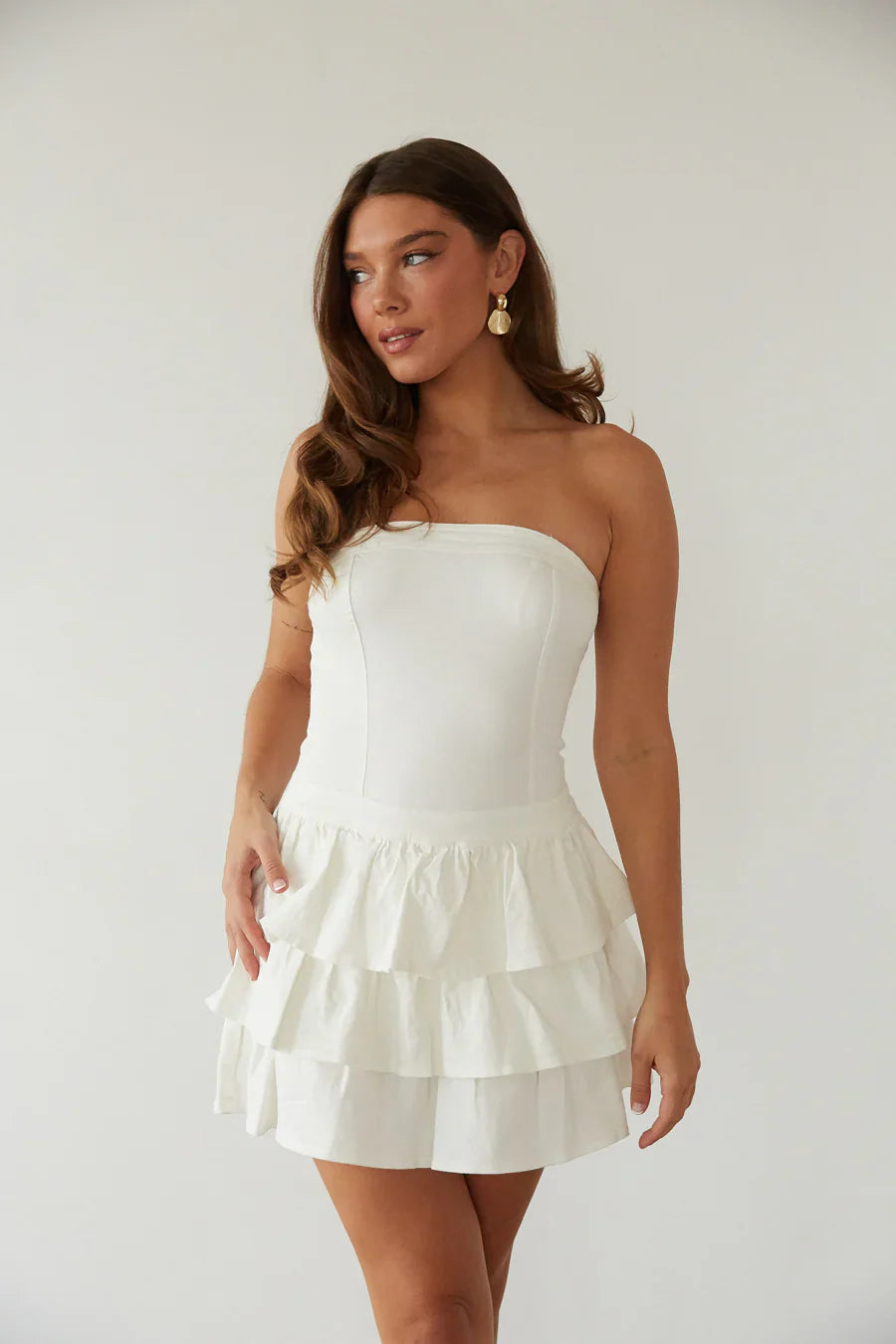 Channel your inner white swan in the Venus Strapless Ruffle Mini Dress! This features a strapless neckline, and tiered ruffle skirt! Available in White Denim; to complete the look!