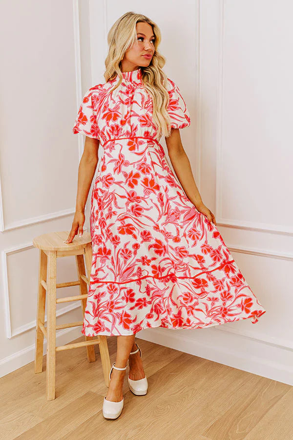 - Step into the sweet side of style with this darling midi dress! With its charming floral print and chic mock neckline, this cutie is all about letting your style bloom. - Lightweight material with an abstract floral print featuring tangerine and a pink hue - A built-in lining ending above the knee - A mock neckline with back tie closure - A smocked detail on the back - A waistline with an elastic section on the back - Hidden side pockets - A flowy and flattering silhouette that ends in a straight, midi length hemline