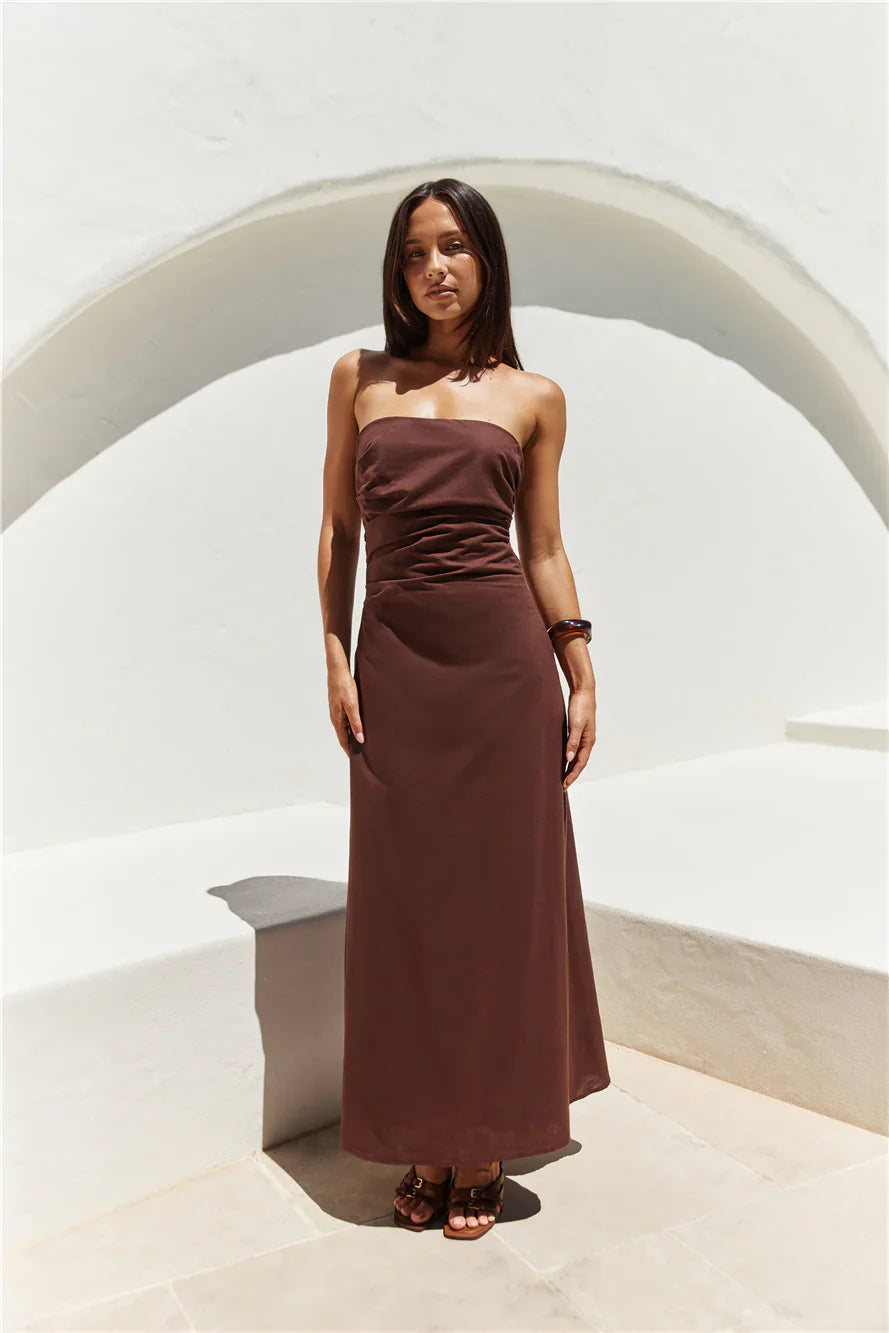 Yasmin Strapless Maxi Dress in Brown embodies effortless sophistication with a minimal yet striking silhouette. Designed in a rich chocolate hue, this strapless maxi dress features soft ruched detailing at the waist, creating a flattering shape that hugs in all the right places. The structured bodice ensures a secure fit, while the fluid, A-line skirt moves gracefully with every step. Perfect for golden hour moments and sunset soirées, pair it with strappy sandals and bold gold accessories for a timeless, elevated look.